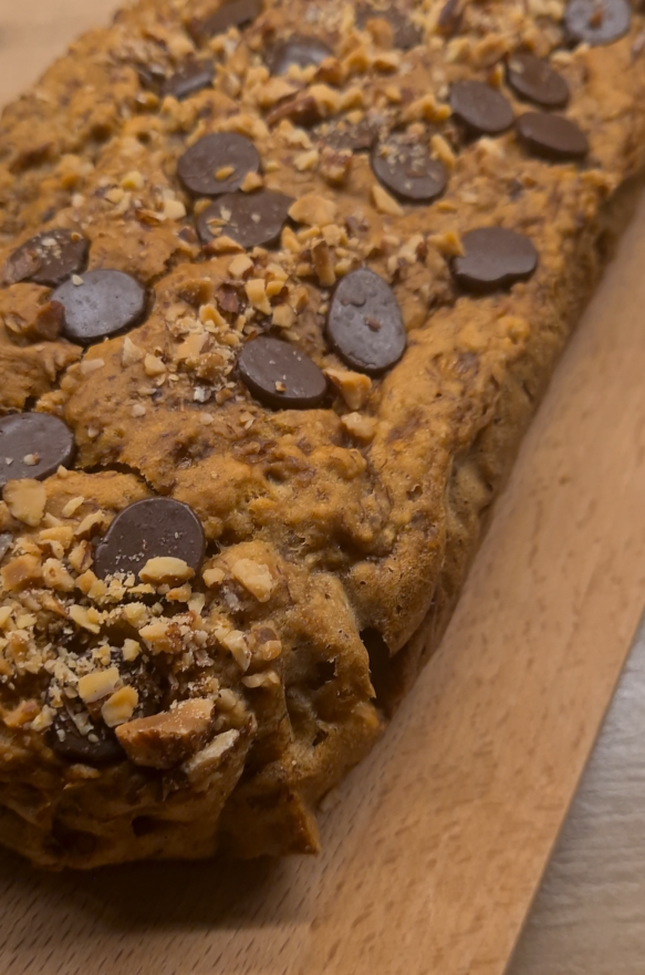 Sve sastojke lagano pomešaj, pa smesu prebaci u kalup. Po vrhu dodaj još malo čoko dugmića i krupno seckanih badema – za dodatni šmek i hrskavost.