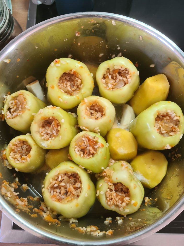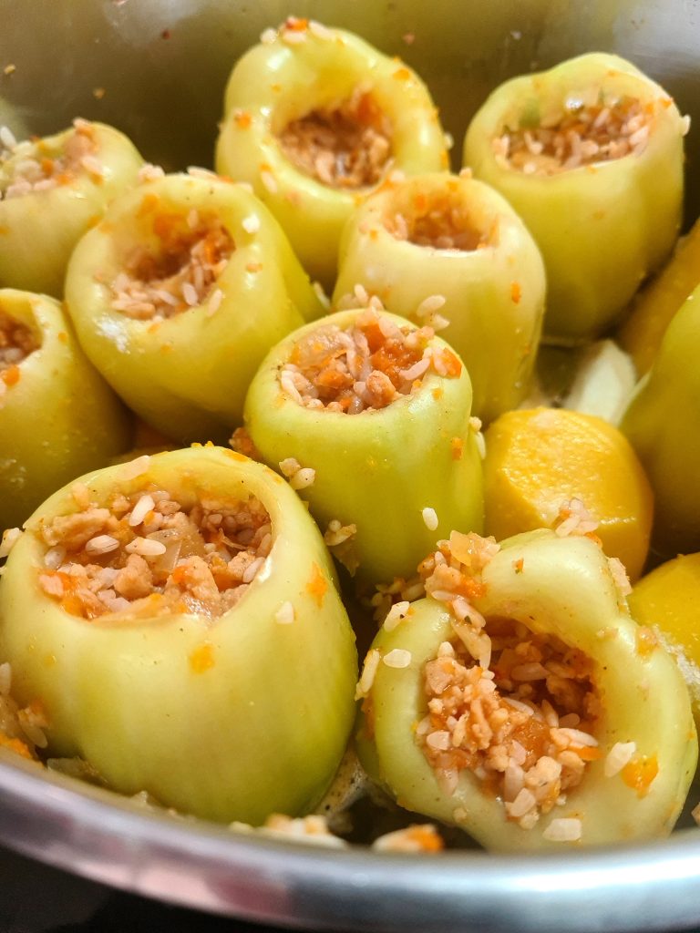 - Očišćene paprike napunite smesom i poređajte ih uspravno u šerpu.